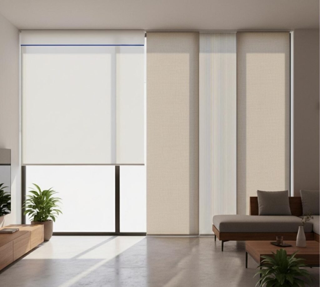 Sistema de paneles deslizantes perfecto para grandes ventanales, puertas de terraza o salones. Aporta estética minimalista y control de luz suave.