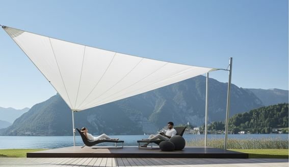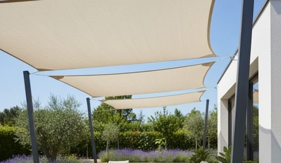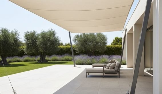 Vela abierta que ofrece sombra ligera del 50%, ideal para crear ambientes relajados en terrazas y jardines.
